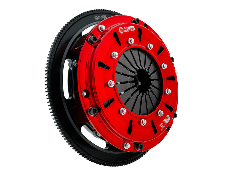 The Action Clutch 10in Twin Disc race kit is engineered specifically for dedicated high powered race vehicles, delivering durability and reliable performance. This is the chosen clutch for those making serious power, supporting up to 1,250tq! This unit features two unsprung 6 puck MIBA Ceramic Discs, with some very light engagement noise/chatter. Our strapped pressure plate is cut from 6061-T6 Billet Aluminum for maximum weight savings and durability. Paired with a lightweight Chromoly Steel Flywheel for optimal balance of the assembly and superior strength. This kit comes with a premium hydraulic release bearing which will offer a lighter clutch pedal making the clutch more comfortable to modulate. No compromises were made in this kit, ensuring optimal performance even under extreme conditions. This kit is not intended for daily use and should only be used in race applications.